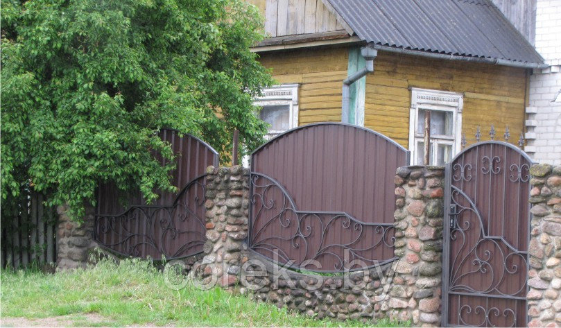 Материал : заполнение металлопрофилем, каркас выполнен из профильной трубы 20х40мм, кованые декоративные элементы выполнены из квадрата 10х10мм,