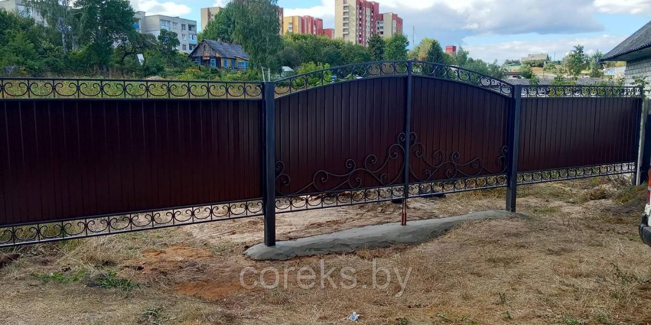 Материал : заполнение металлопрофилем, каркас выполнен из профильной трубы 20х40мм, 40х40 мм, кованые декоративные элементы выполнены из квадрата 10х10мм,